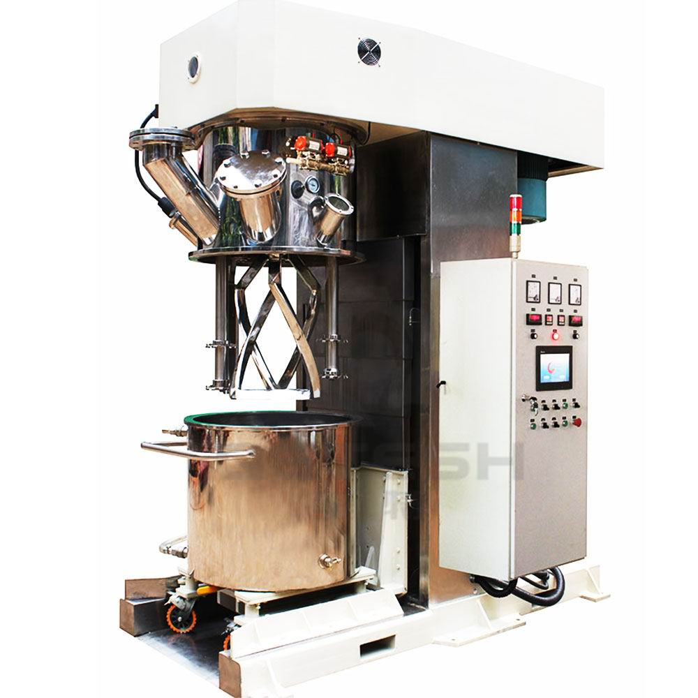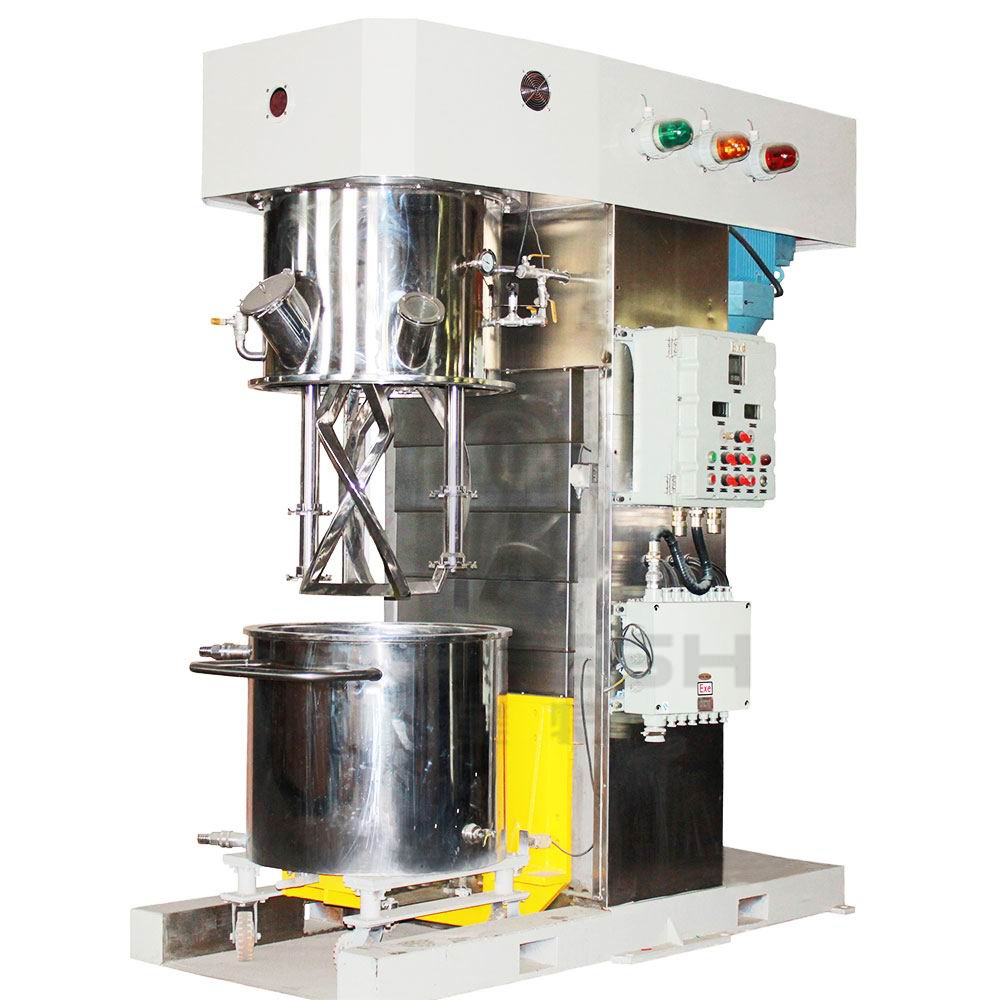 双行星动力混合机是一种新型且对多种混合液体、粉体进行搅拌、溶解、分散、均质效率好的搅拌设备。该设备配有高速、低速、活动刮板部件,低速搅拌部件采用行星齿轮传动,搅拌桨在公转时也自转,使物料上下及四周运动,从而在较短的时间内达到理想的混合效果。高速分散/乳化部件与行星箱一起公转,同时高速自转,使物料受到强烈的剪切与分散混合,罐体内壁为大型立车精加工,再经大型抛光机自动抛光,确保行星箱上的活动刮刀在旋转时,把罐体内壁上的物料完全刮掉,其混合效果是普通混合机的几到几十倍。多应用于电池、有机硅胶、好油墨、染料、粘胶剂、高粘度涂料等化工产品的生产。