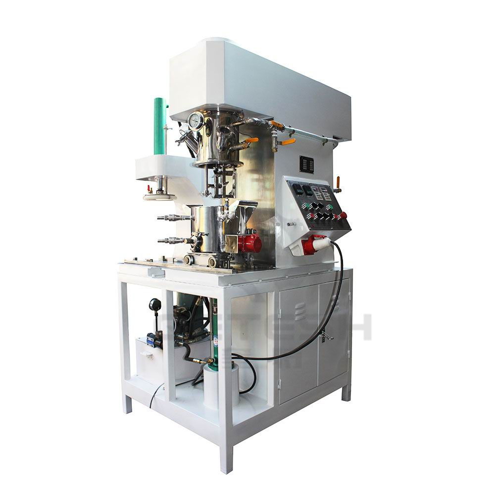 双行星动力混合机是一种新型且对多种混合液体、粉体进行搅拌、溶解、分散、均质的搅拌设备。该设备配有高速、低速、活动刮板部件,低速搅拌部件采用行星齿轮传动,搅拌桨在公转时也自转,使物料上下及四周运动,从而在较短的时间内达到理想的混合效果。高速分散/乳化部件与行星箱一起公转,同时高速自转,使物料受到强烈的剪切与分散混合,罐体内壁为大型立车精加工,再经大型抛光机自动抛光,确保行星箱上的活动刮刀在旋转时,把罐体内壁上的物料完全刮掉,其混合效果是普通混合机的几到几十倍。广泛应用于电池、有机硅胶、高端油墨、染料、粘胶剂、高端高粘度涂料等化工产品的生产。